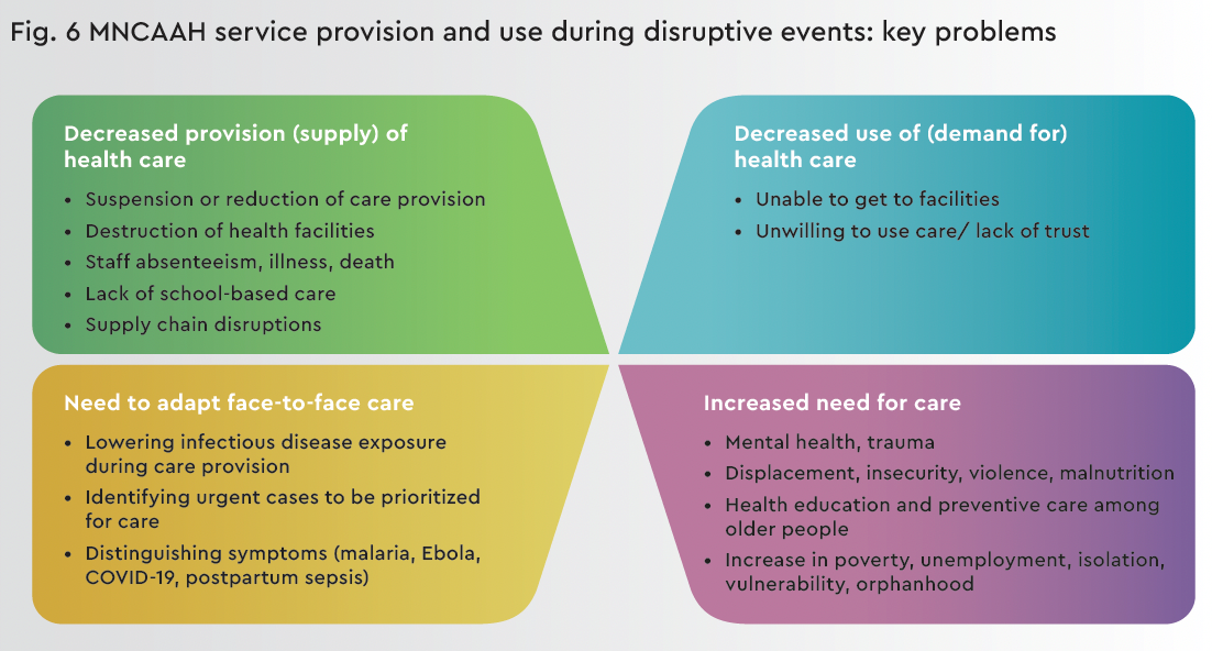 In the events reviewed, not all problem types were found to be of equal magnitude or presence, except for COVID-19. In this case, all four occurred and affected MNCAAH provision and use. The disruptions and increased needs for health services were mainly due to the measures taken to prevent the spread of the virus, such as lockdowns, curfews and limits on public transportation.